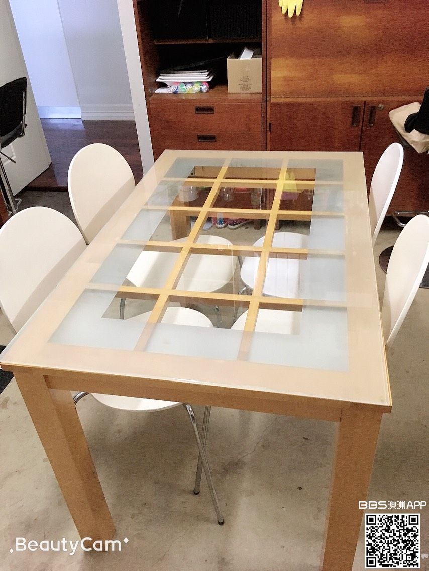 一个玻璃面的餐桌和四把非常结实的餐椅。非常结实耐用,美观大气。 可送货上门。 联系电话:0481 553 292