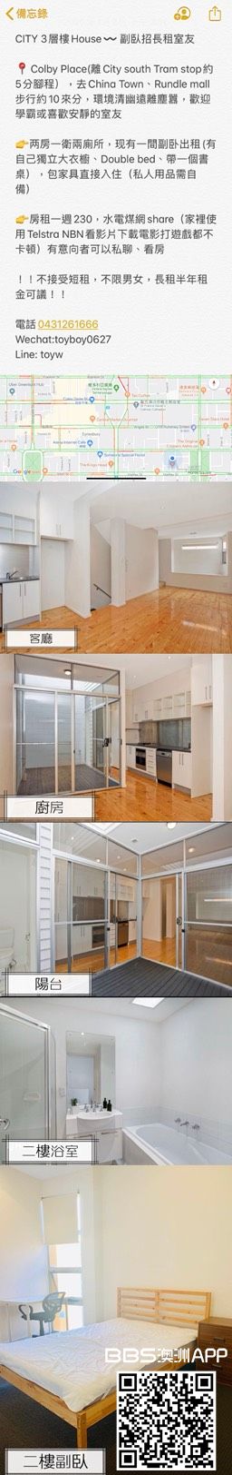 CITY 3層樓House 副臥招長租室友 Colby Place(離City south Tram stop約5分腳程),去China Town、Rundle mall步行約10來分,環境清幽遠離塵囂,歡迎學霸或喜歡安靜的室友 两房一衛兩廁所,现有一間副卧出租(有自 ...