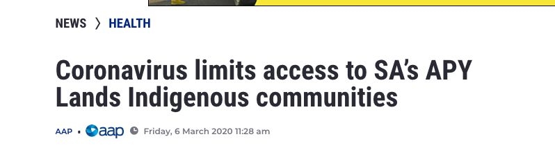出于冠状病毒的潜在威胁的担忧, 南澳偏远地执行委员会将停止在接下来的三个月中定期向高风险群体发放许可证。 APY地区的总管Richard King说, 这些偏远的原住民社区特别脆弱, 所以我们需要保持警惕, ...