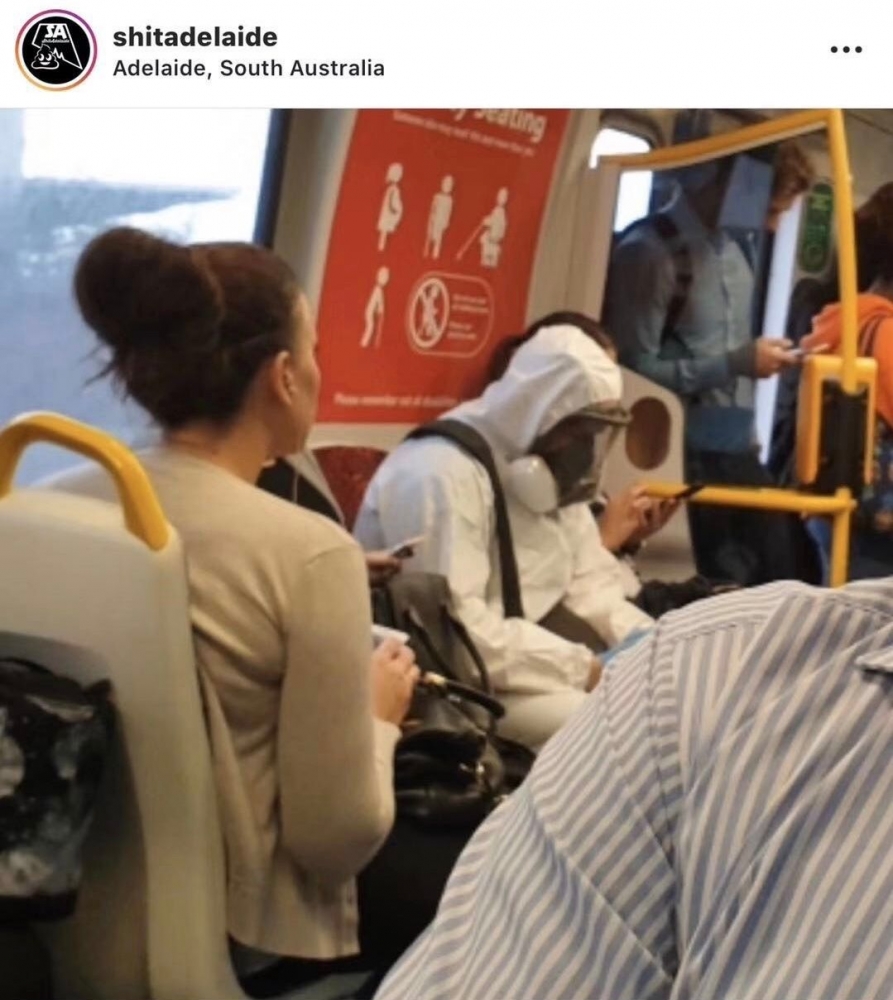 据ins网友爆料, 今天上午,一位身穿全套防护服的乘客出现在阿德莱德tram的harbour线内!