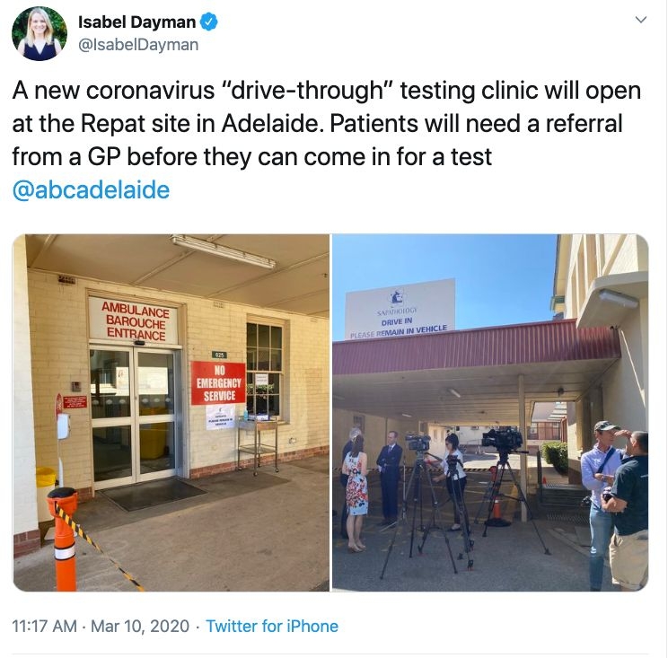 据ABC Adelaide 报道, 一个新的新冠病毒“drive-through”检测诊所在阿德莱德的Repat医院启动。