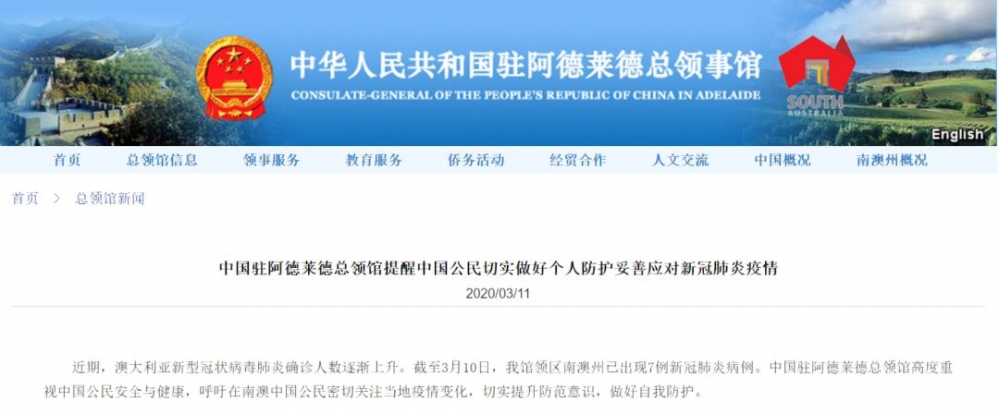 中国驻阿德莱德总领馆11日发布消息: 中国驻阿德莱德总领馆高度重视中国公民安全与健康,呼吁在南澳中国公民密切关注当地疫情变化,切实提升防范意识,做好自我防护。 一、密切关注澳卫生部、南澳州卫生部等官 ...
