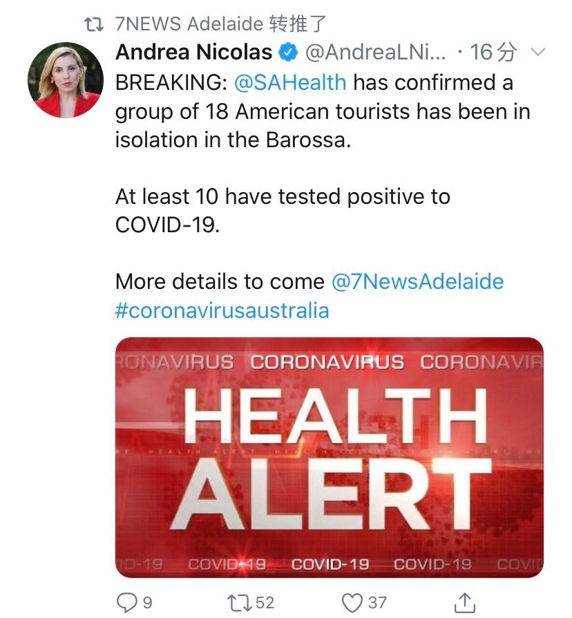 刚刚! SA Health确认,一组来自美国的游客,共18人, 目前正在Barossa隔离。 其中,至少有10个人确诊,还有四名成员正在等待测试结果。 他们将在自己的住所进行隔离。 该旅游团在来到南澳之前访问了 ...