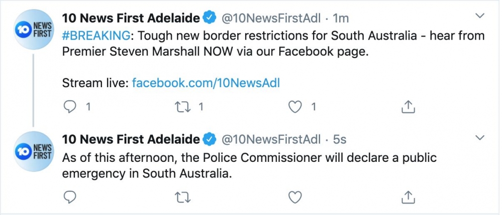 今天中午,南澳警署宣布南澳进入公共紧急状态, 南澳州长突然宣布从周二下午四点开始封锁南澳边境! 如果人们需要穿越边境, 则需要提供必需的证明和理由, 任何进入的南澳的人都将要进行14天的 ...