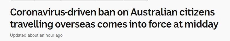 据ABC News报道,禁止澳大利亚公民出国旅行的禁令将于今天中午生效。 总理Scott Morrison周二晚说:“在这段期间,大家不要乘飞机出国旅行。”