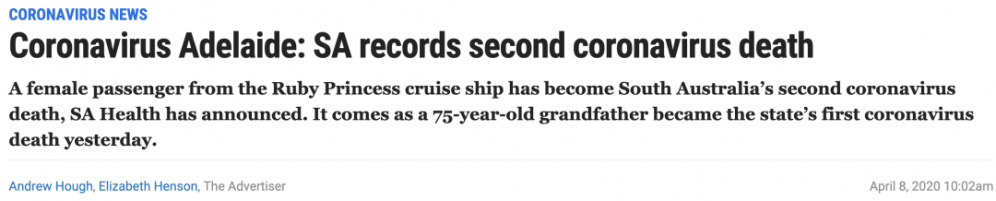 南澳卫生部宣布,南澳出现第二例新冠病毒死亡病例,死者为Ruby Princess游轮的一名女乘客,这艘邮轮目前正在接受新州警方的刑事调查。 这名62岁的阿德莱德女子在皇家阿德莱德医院于今天凌晨死亡。