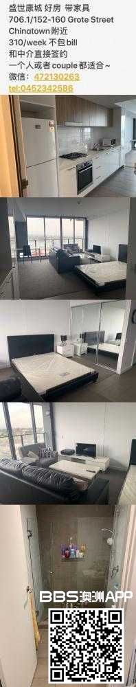 盛世康城 好房 带家具 706.1/152-160 Grote Street Chinatown附近 310/week 不包bill 和中介直接签约 一个人或者couple都适合~ 微信:472130263 tel:0452342586