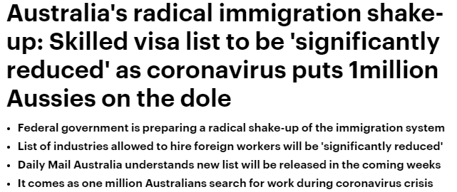澳大利亚大规模移民改革: 技术移民签证将大幅减少,因冠状病毒导致100万澳大利亚人领取失业救济金。 据《每日邮报》报道,联邦政府正准备对移民制度进行彻底改革,允许雇佣外国员工的行业将大幅减少。 研究报 ...