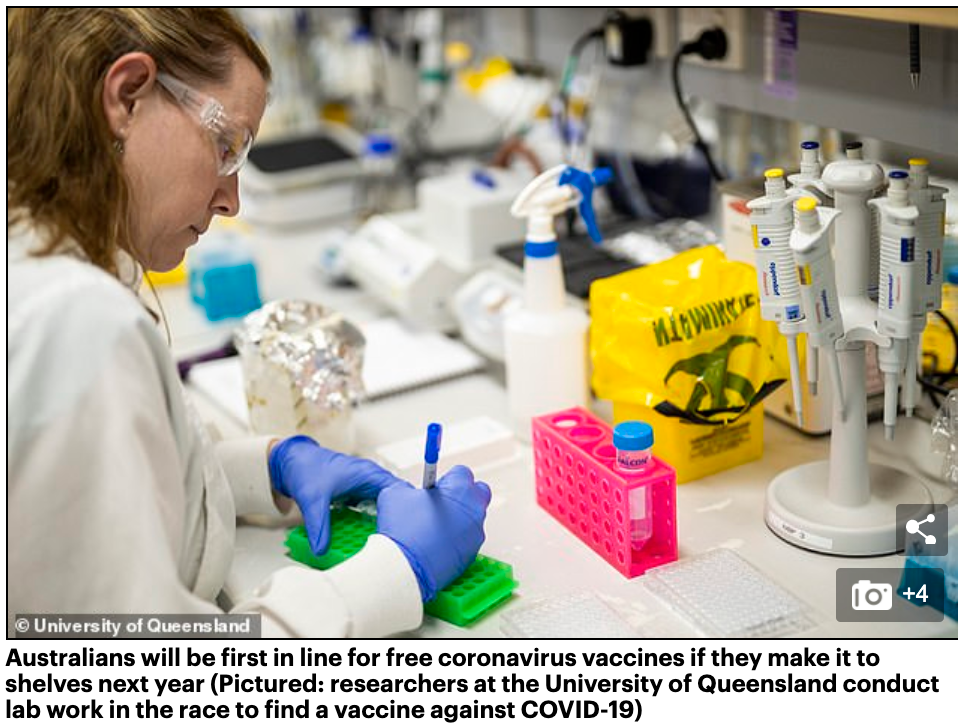据Daily Mail报道,如果科学家成功研制出COVID-19疫苗,澳大利亚人将优先获得免费的新冠病毒疫苗。 昆州政府已经达成一项协议,如果昆士兰大学成功研制出COVID-19疫苗,有关部门将生产1亿瓶疫苗。 这将足够提 ...
