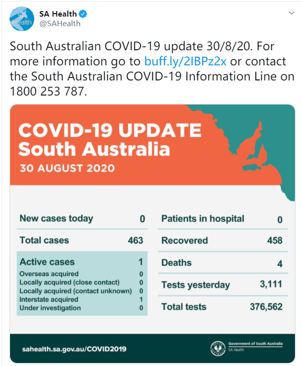 在过去的24小时里,南澳零新增。 总确诊病例463例,活跃病例1例。 来源:7News,SA Health