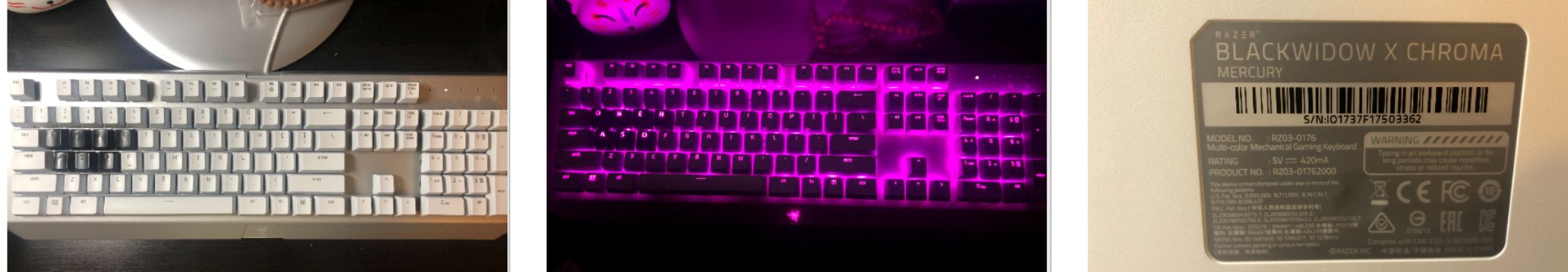 雷蛇(Razer)黑寡妇全尺寸游戏键盘(Blackwidow x Chroma keyboard)。9成新,表面无划痕,具有Chroma功能灯光可随意调节。随键盘附送7个金属键帽(QWERASD)和键盘背包V2。价格:$100。有意可联系:0434057884。
