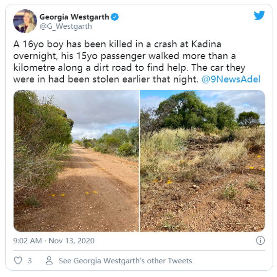 今天凌晨,在南澳约克半岛的Kadina发生一起交通事故。一名16岁的少年驾驶一辆刚偷来的汽车后发生事故,当场身亡。同车的好友不得不在深夜的土路上步行一公里多求救。 重大事故调查人员在凌晨5点15分左右赶到现 ...