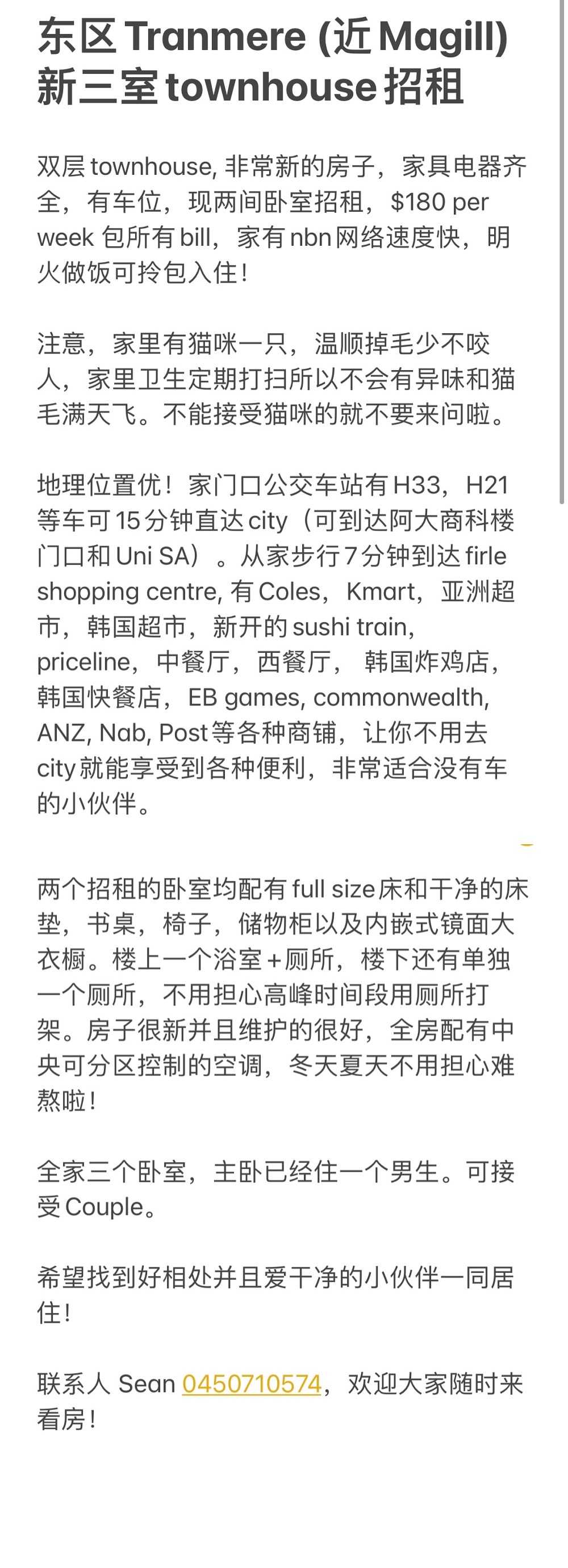 东区Tranmere (近Magill) 新townhouse 两间卧室招租