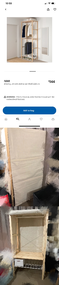 IKEA全新拼装实木衣柜,全套200多刀(帘布就要40),特别好看且实用,所有单个零件都已经配好,直接可以拼装使用,89x50x226,不占空间容量巨大,100自提,可送脏衣篮和小鞋架 tel: 0476222546