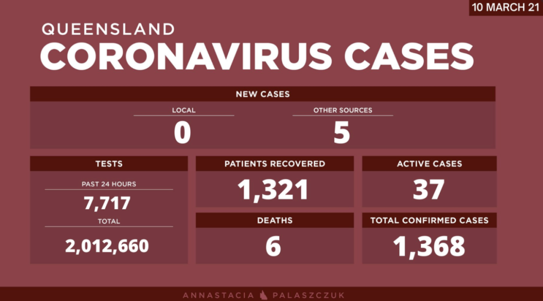 在过去的24小时内,昆州新增5例海外输入病例。 目前昆州有37个活跃病例,已进行了2012660次病毒检测。 截至今天,昆州11996名一线卫生和酒店检疫人员已接种疫苗。 Palaszczuk女士说:“疫苗给了我们希 ...