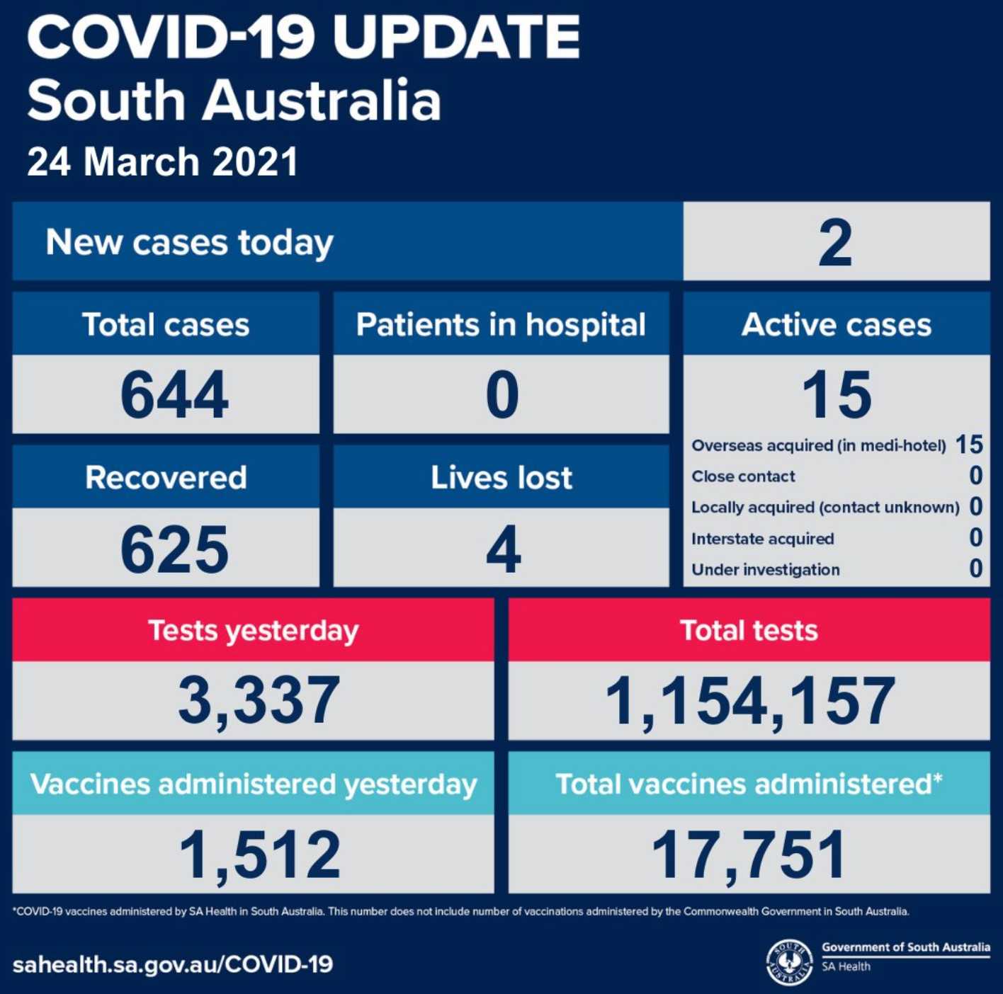 在过去的24小时内,南澳新增2例海外输入病例。 目前南澳有15个活跃病例,已进行了1154157次病毒检测,已接种了17751剂疫苗。 警察局长Grant Stevens说,在今天的过渡委员会中,当局对公众集会和密 ...
