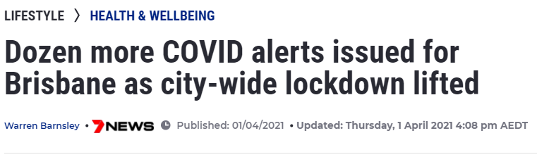 据澳媒报道,今天布里斯班全城封锁解除,又有十几个COVID-19警报地点发布。 新警报地点: 3月16日周二上午9点半至10点,Nextra Toowong Village in Toowong 3月16日星期二下午2点30分至2点45分,Meat at Bi ...