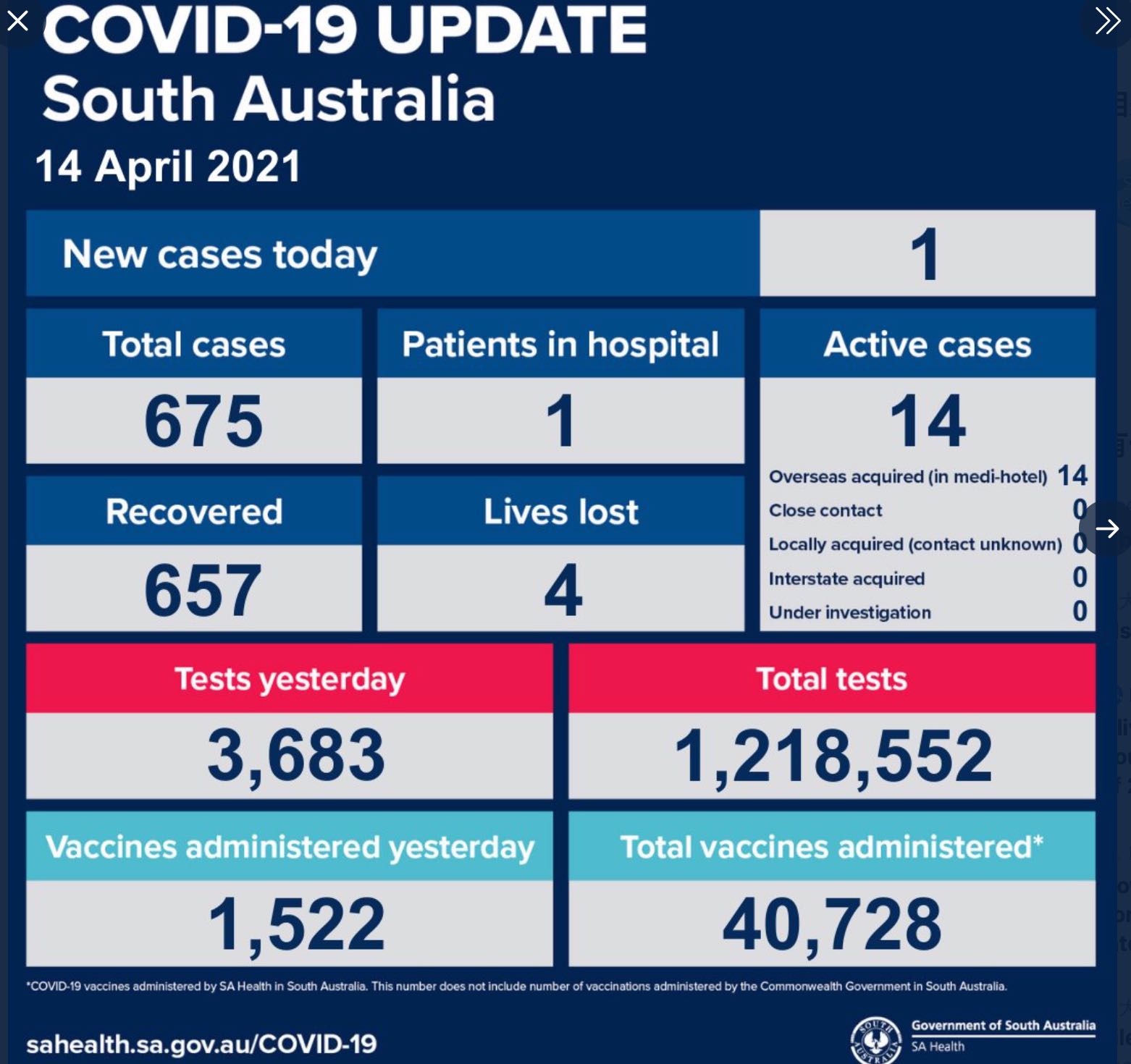 据南澳大利亚州卫生局14/4/21 的更新,过去24小时南澳新增新冠确诊病例1例,全州截止14日总共确诊675例,康复657例,死亡4例,目前仍在医院中接受治疗的有15例。 昨日检测数量共又3683次,累计检测数量为1218552次 ...