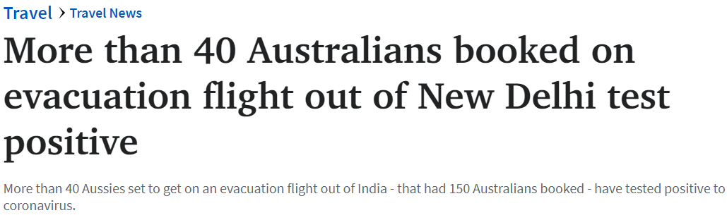 据最新消息,超过40名澳大利亚人在新德里的疏散航班上被检测出阳性。 图文来源:The Advertiser, 6pr原文链接原文链接