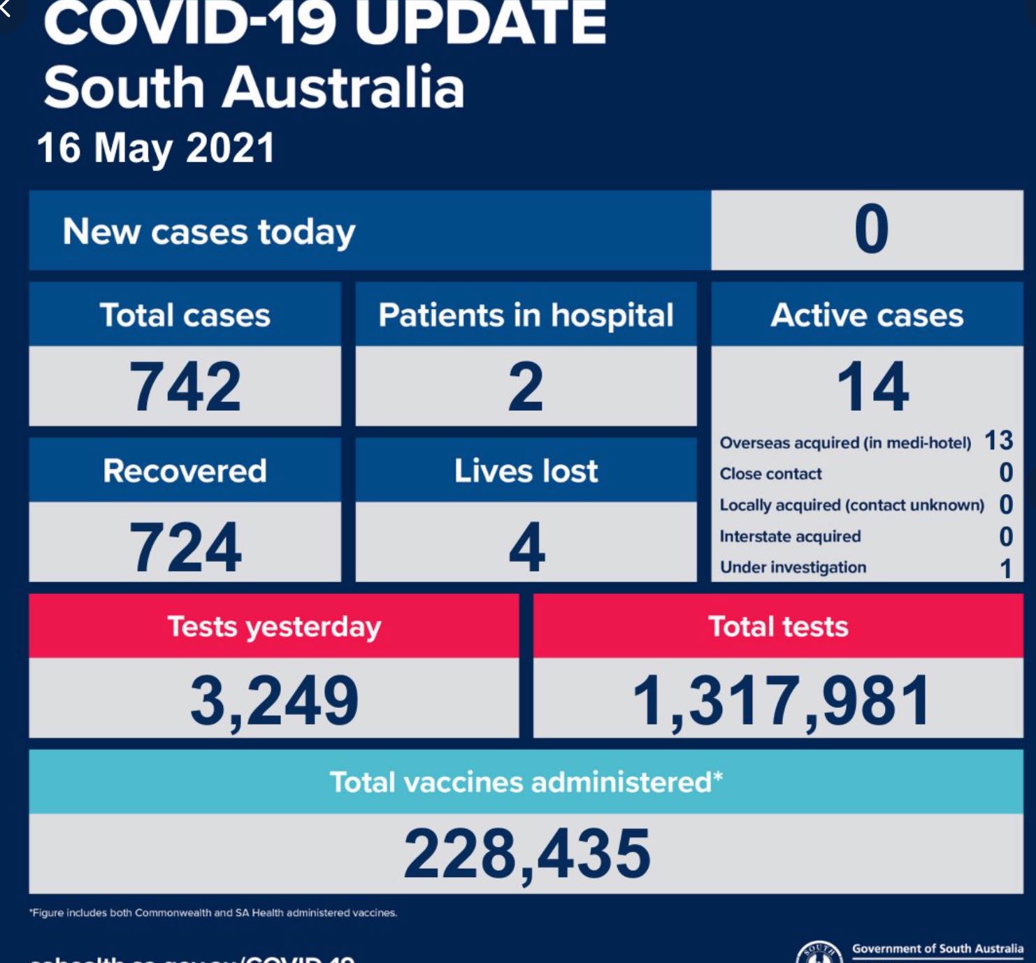 2021年5月16日,星期日,南澳新冠病例情况更新如下: 无新增确诊病例。 活跃病例14例,仍有2例患者在医院中康复与治疗。 康复723例,死亡4例。 昨日共进行检测3249次,累计检测1317981次。 图 ...
