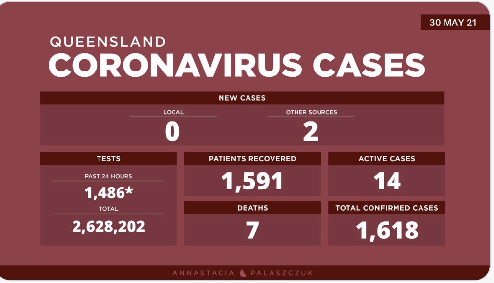 5月30日星期日- 昆士兰的冠状病毒病例更新: - 0例新的本地感染病例 - 2例海外感染病例 - 14例活动病例 -累计确诊 1,618例 - 进行了2,628,202次测试 不幸的是,7名COVID-19患者已经死亡。1,591名患 ...