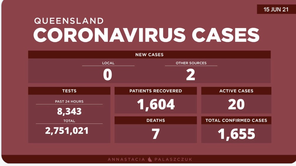 6月15日星期二- 昆士兰的冠状病毒病例更新: - 0例新的本地感染病例 - 2例海外感染病例 - 20例活动病例 -累计确诊 1,655例 - 累计进行了2,75,1021次核算测试 不幸的是,7名COVID-19患者已经死亡。1, ...