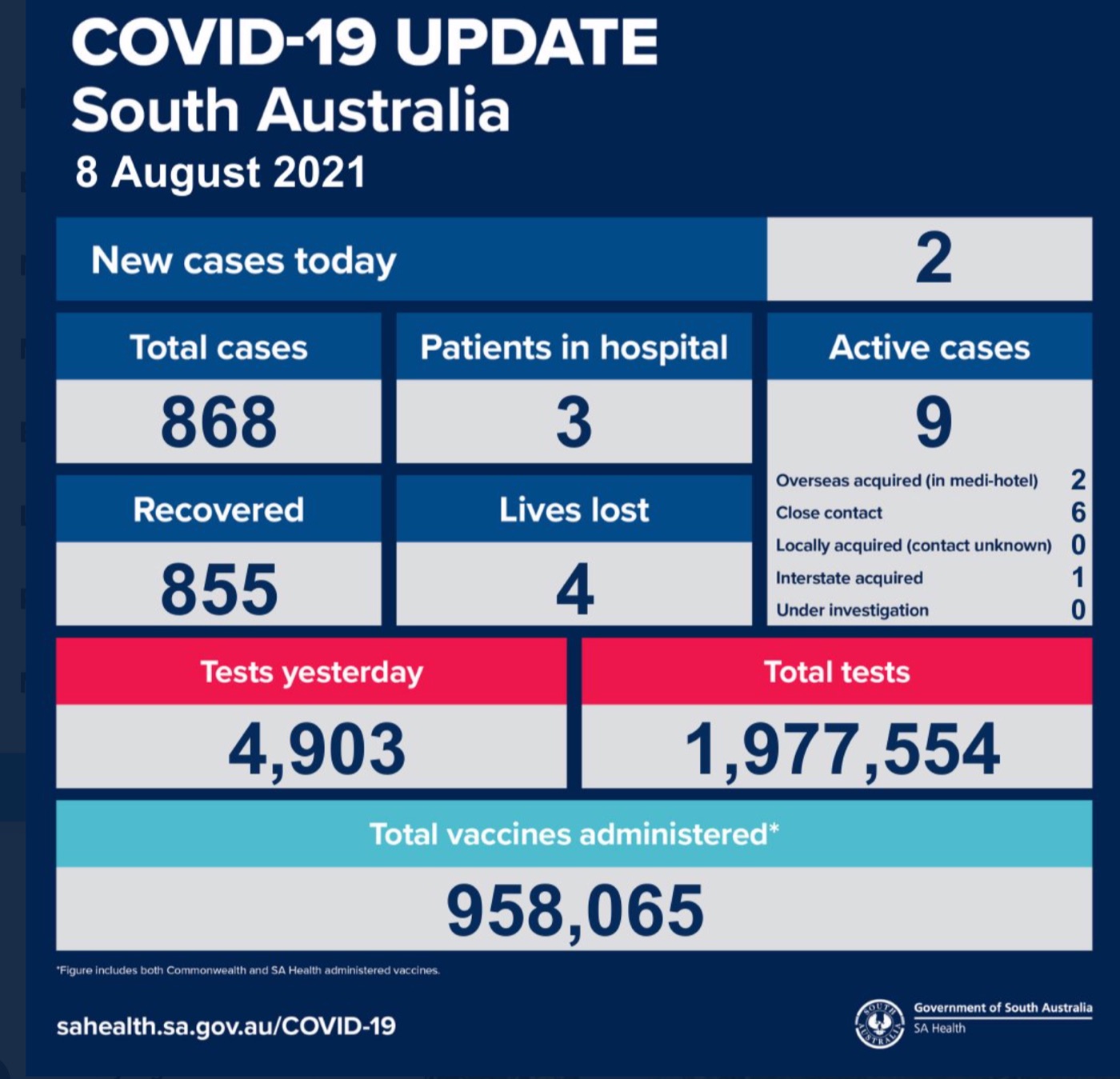 2021年8月8日,星期日,南澳新冠病例情况更新如下: 新增确诊病例2例!无本土感染新增! 活跃病例9例,3名患者在医院中康复与治疗。 康复855例,死亡4例。 昨日共进行检测4903次,累计检测1977544次。 ...