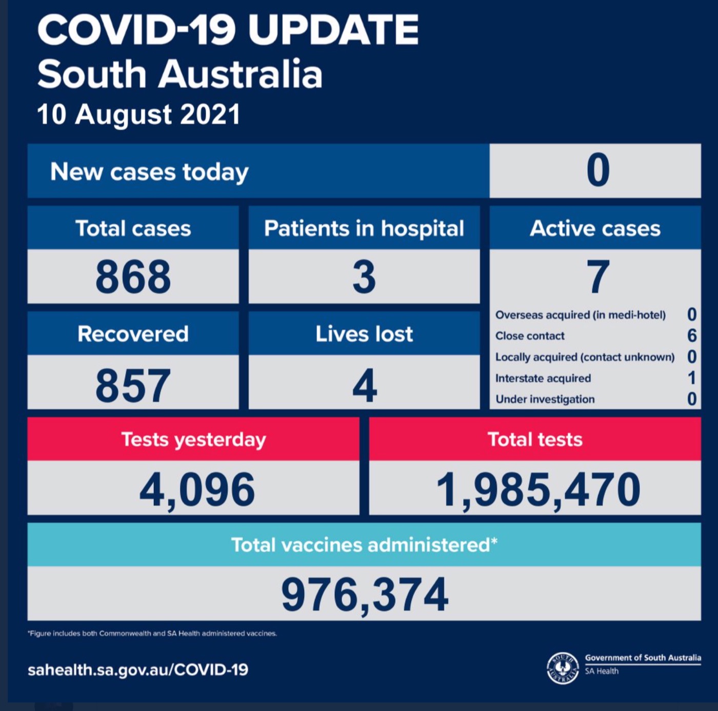 2021年8月10日,星期二,南澳新冠病例情况更新如下: 无新增确诊病例! 活跃病例7例,3患者在医院中康复与治疗。 康复857例,死亡4例。 昨日共进行检测4096次,累计检测1985470次 图文 ...