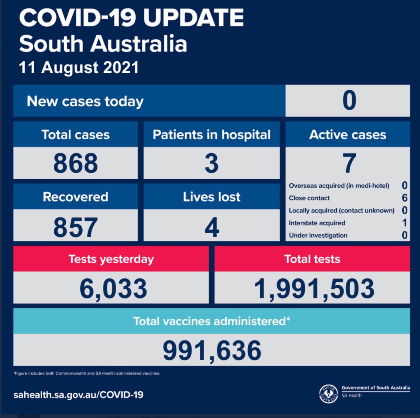 2021年8月11日,星期三,南澳新冠病例情况更新如下: 无新增确诊病例! 活跃病例7例,3患者在医院中康复与治疗。 康复857例,死亡4例。 昨日共进行检测6033次,累计检测1991503次 图文来源:S ...