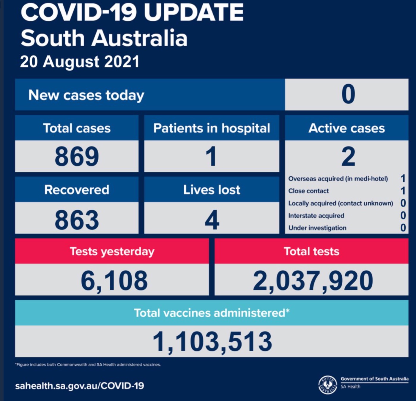 2021年8月20日,星期五,南澳新冠病例情况更新如下: 无新增确诊病例! 活跃病例2例,1患者在医院中康复与治疗。 康复863例,死亡4例。 昨日共进行检测6108次,累计检测2037920次 图文来源:S ...
