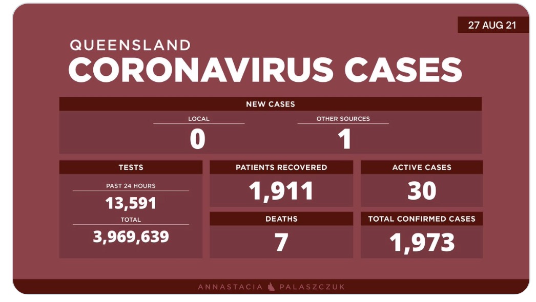 8月27日星期五- 昆士兰的冠状病毒病例更新: - 0例新的本地感染病例 - 1例海外感染病例 - 30例活动病例 -累计确诊 1,973例 - 累计进行了3,96,9639次核酸测试 图文来源:Twitter 原文链接