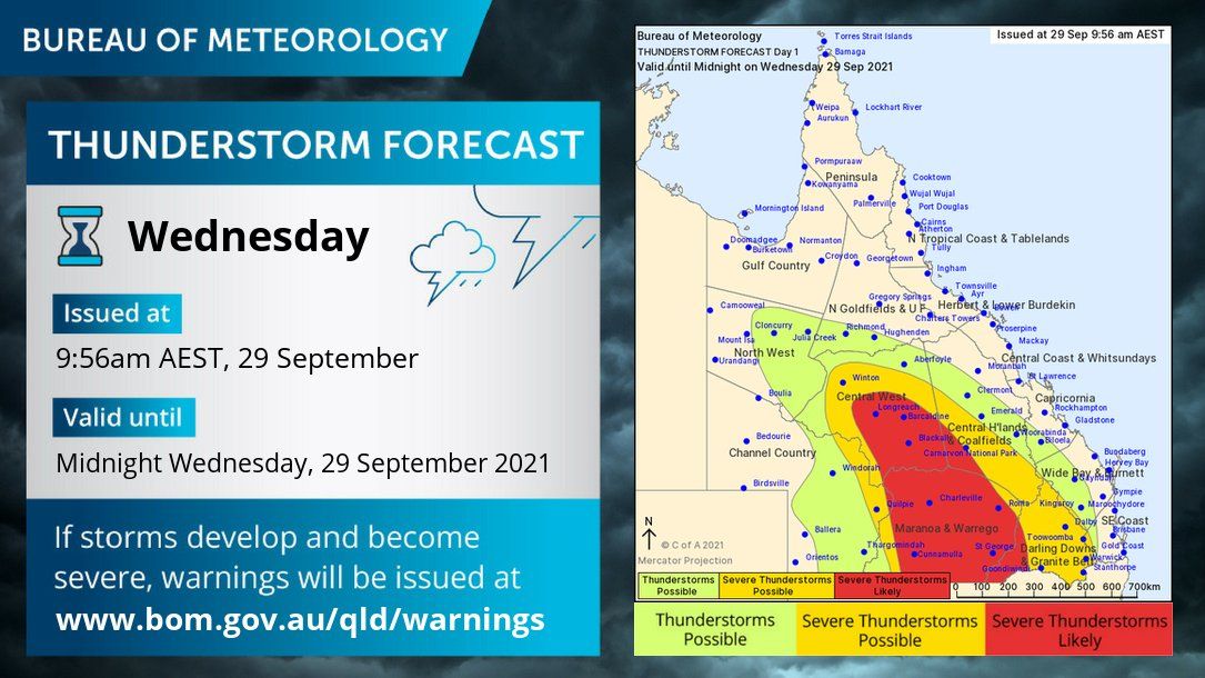 昆士兰气象局2021年9月29日(星期三)上午11:03发布。 今天雷暴和降雨将出现在昆士兰的大部地区,发生的雷暴预计将持续到今天晚间。 有些雷暴预计会很严重--特别是在中西部、Maranoa和Warrego以及Darling Downs, ...