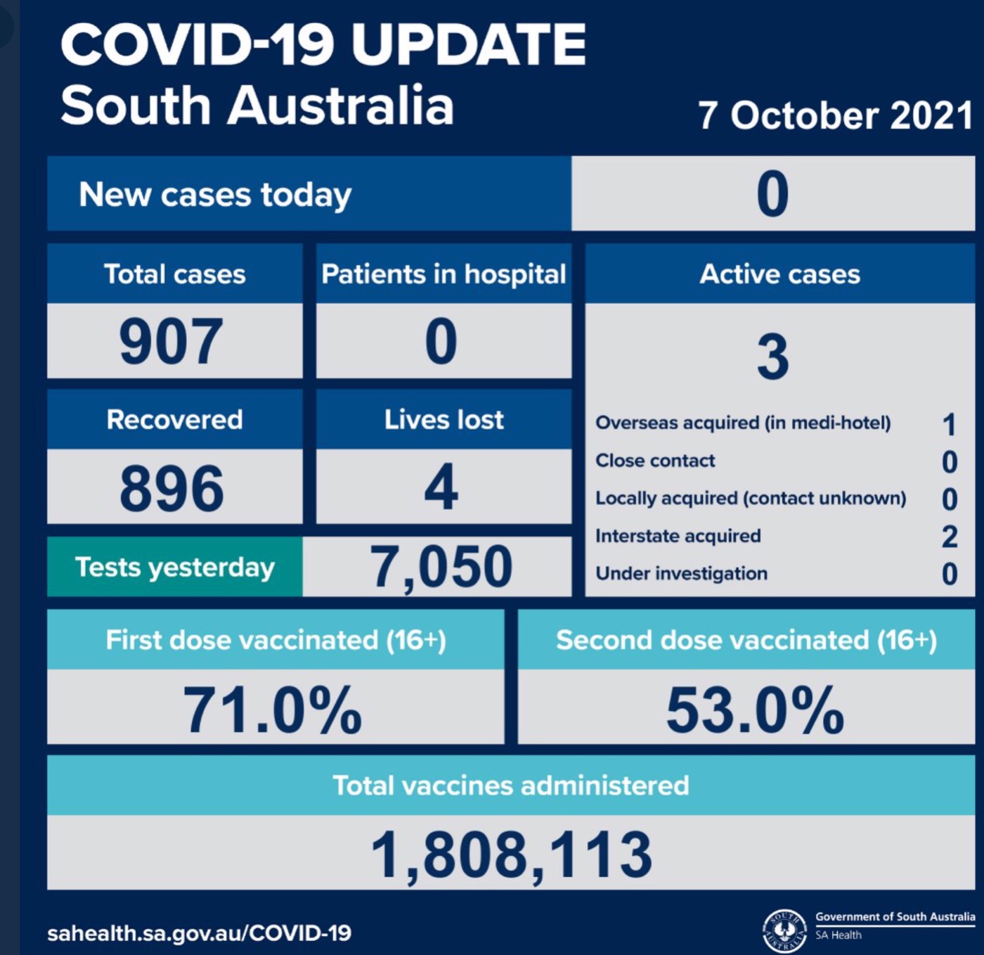 2021年10月7日,星期四,南澳新冠病例情况更新如下: 本地无新增确诊病例; 活跃病例3例,无患者在医院中康复与治疗。 共康复896例,死亡4例。 昨日共进行检测7050次。 第一针疫苗接种率为71%,第二 ...