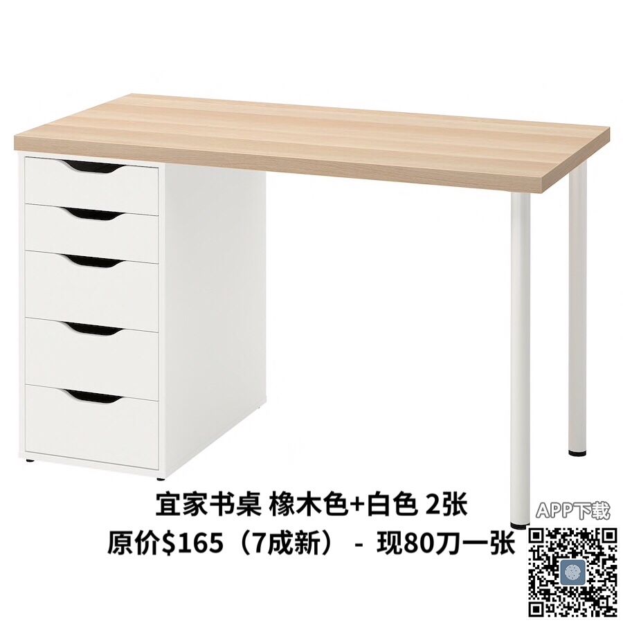 宜家书桌 橡木白色 2张 原价$165(7成新) - 现80刀一张。宜家办公椅 黑色x2 原价$75(9成新)- 现50刀一个。宜家转椅 灰色x2 原价$159 现15刀一个。感兴趣的朋友请加微信:Eunice1700