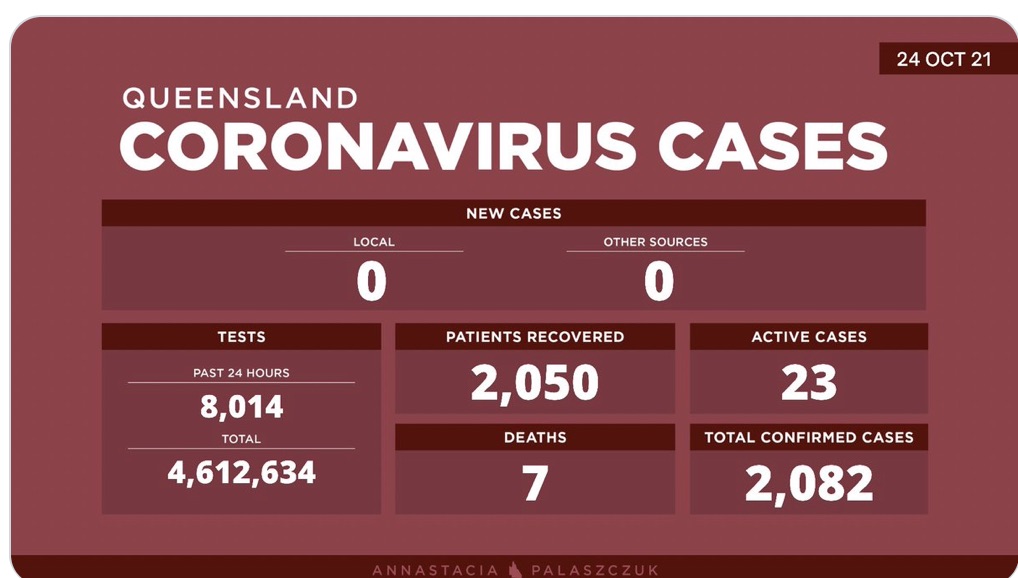 10月24日星期日- 昆士兰的冠状病毒病例更新: - 0例新的本地感染病例 - 0例海外感染病例 - 23例活动病例 -累计确诊 2,082例 -死亡7例,累计康复2050例 -昨日共进行了8014次核酸检测 - ...
