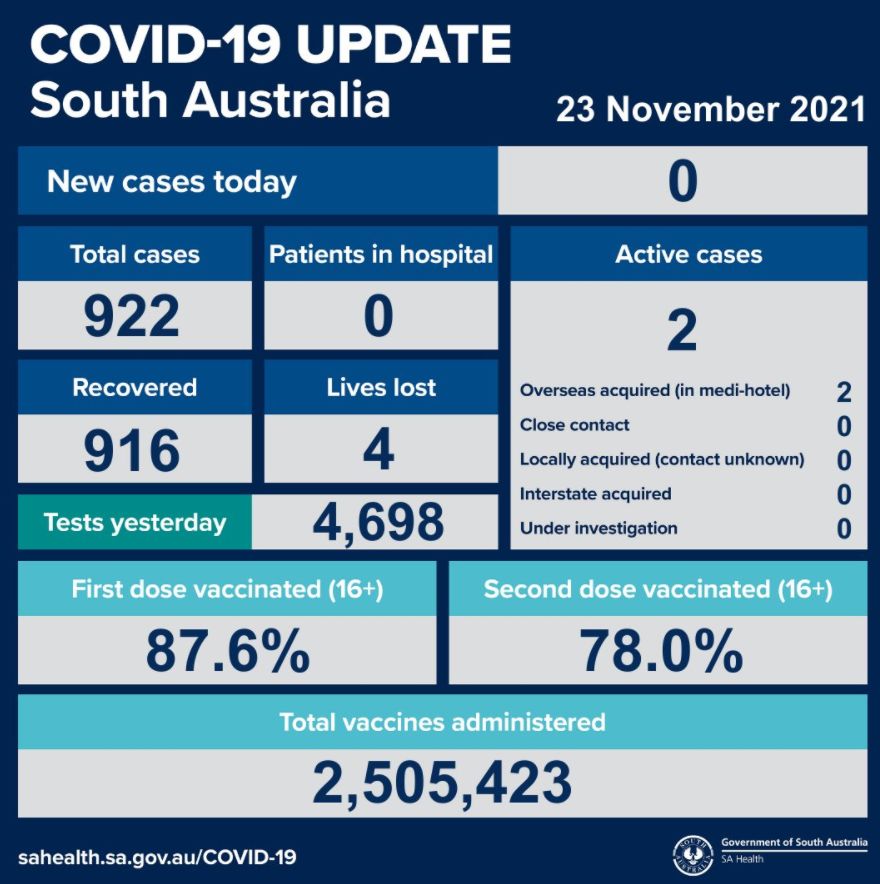 2021年11月23日,星期二,南澳新冠病例情况更新如下: 无新增确诊病例; 活跃病例2例,无患者在医院中康复与治疗。 共康复916例,死亡4例。昨日共进行检测4698次。 第一针疫苗接种率为87.6%,第二针 ...