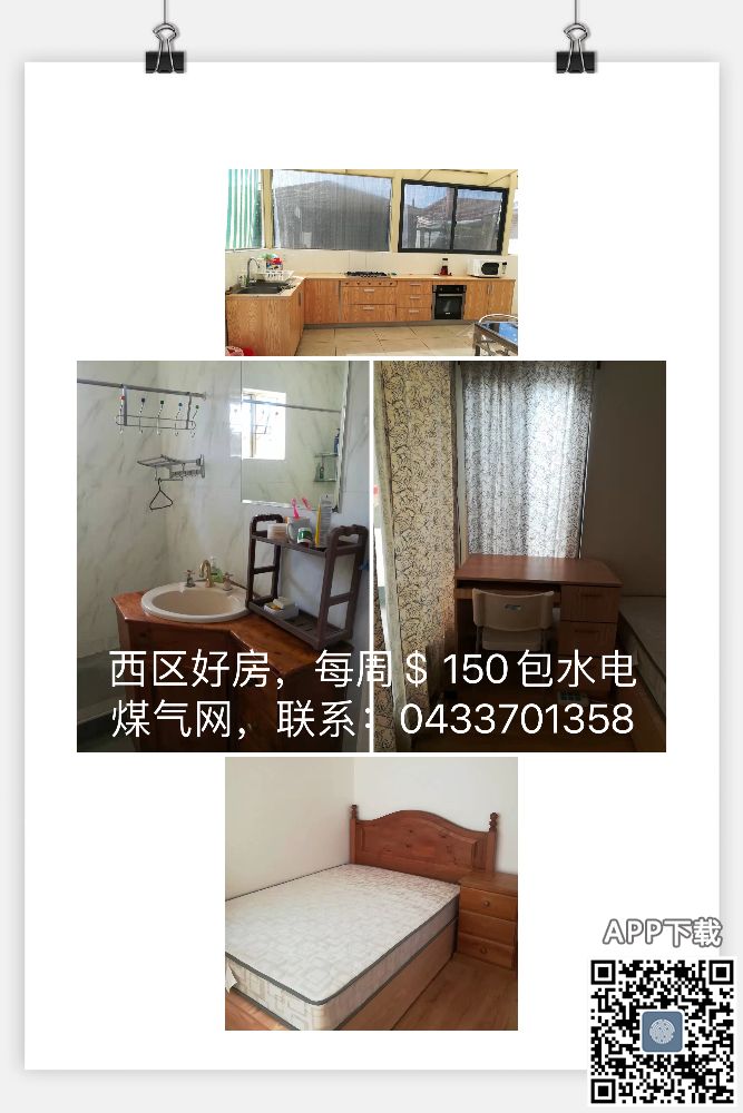 西区好房,每周$150包水电,煤气,无线网 联系电话:0433701358