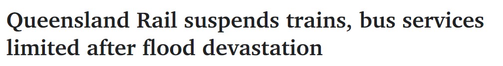 洪水对昆士兰东南部的铁路网络造成严重破坏后,昆士兰铁路的服务仍然暂停。 "交通可能仍然会有一些中断,但只要能正常运行,它就会运行。我们正在尽一切努力使其恢复运行,"TransLink说。 我 ...