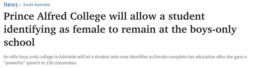 阿德莱德著名私立男校Prince Alfred College将允许一名换性别为女性的学生继续就读,并完成学业。 Alice在星期二向150名12年级学生勇敢地讲述了她作为女性的身份。 "我认为,当她在周二对她的同龄人,对 ...