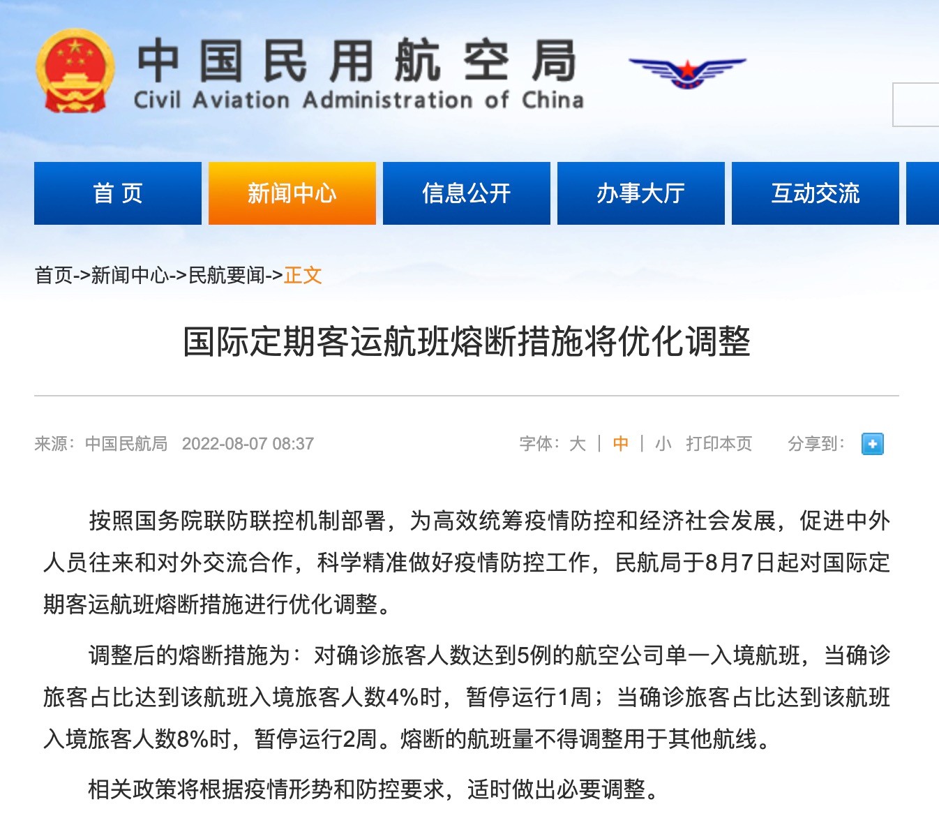 中国民航局发布最新通知,于8月7日起对国际定期客运航班熔断措施进行优化调整。 民航局指出,这一优化调整是按照国务院联防联控机制的部署,为高效统筹疫情防控和经济社会发展,促进中外人员往来和对外交流合 ...