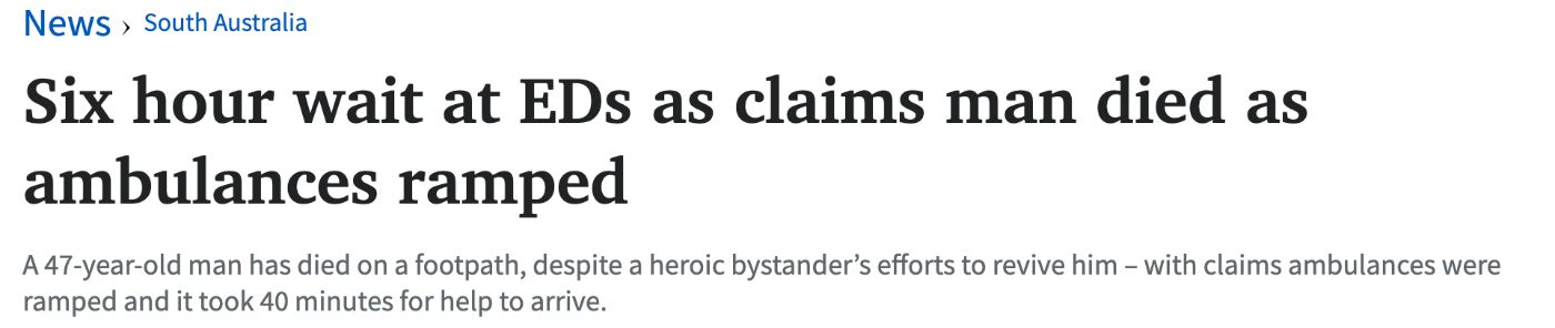 南澳救护车工会报告称,一名47岁的男子在Plympton的人行道上死亡。 Lyell McEwin Hospital的急诊室就诊的平均等待时间超过了6.7小时,Flinders Medical Centre是6.2小时,Modbury Hospital是4.5小时。 在Roy ...