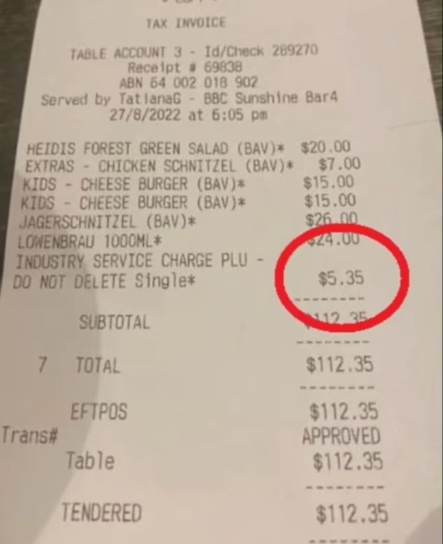 ​昆州一位食客外出就餐后发现,账单上包含“隐藏的”5%的附加费,这让他感到非常震惊。 帖子中写道:“谁能解释一下5.35澳元的服务费是什么,我以前从未遇到过。” 网友们纷纷回复帖子,试图解释这笔 ...