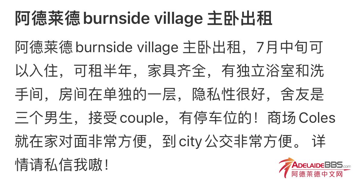 阿德莱德burnside village Coles 对面主卧出租 独立卫浴 可联系0451943383 可以接受couple 有家具 300每周