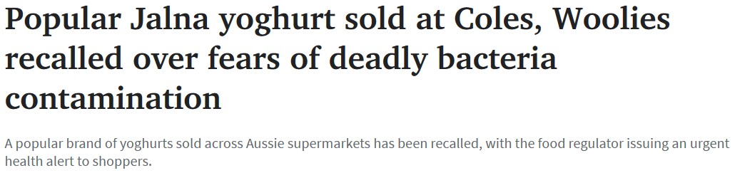 在澳大利亚各超市销售的一种受欢迎的酸奶品牌已经被紧急召回,因为该酸奶可能含有微量致命细菌。 Food Standards Australia and New Zealand一位发言人表示:"任何担心自己健康的消费者应寻求医 ...