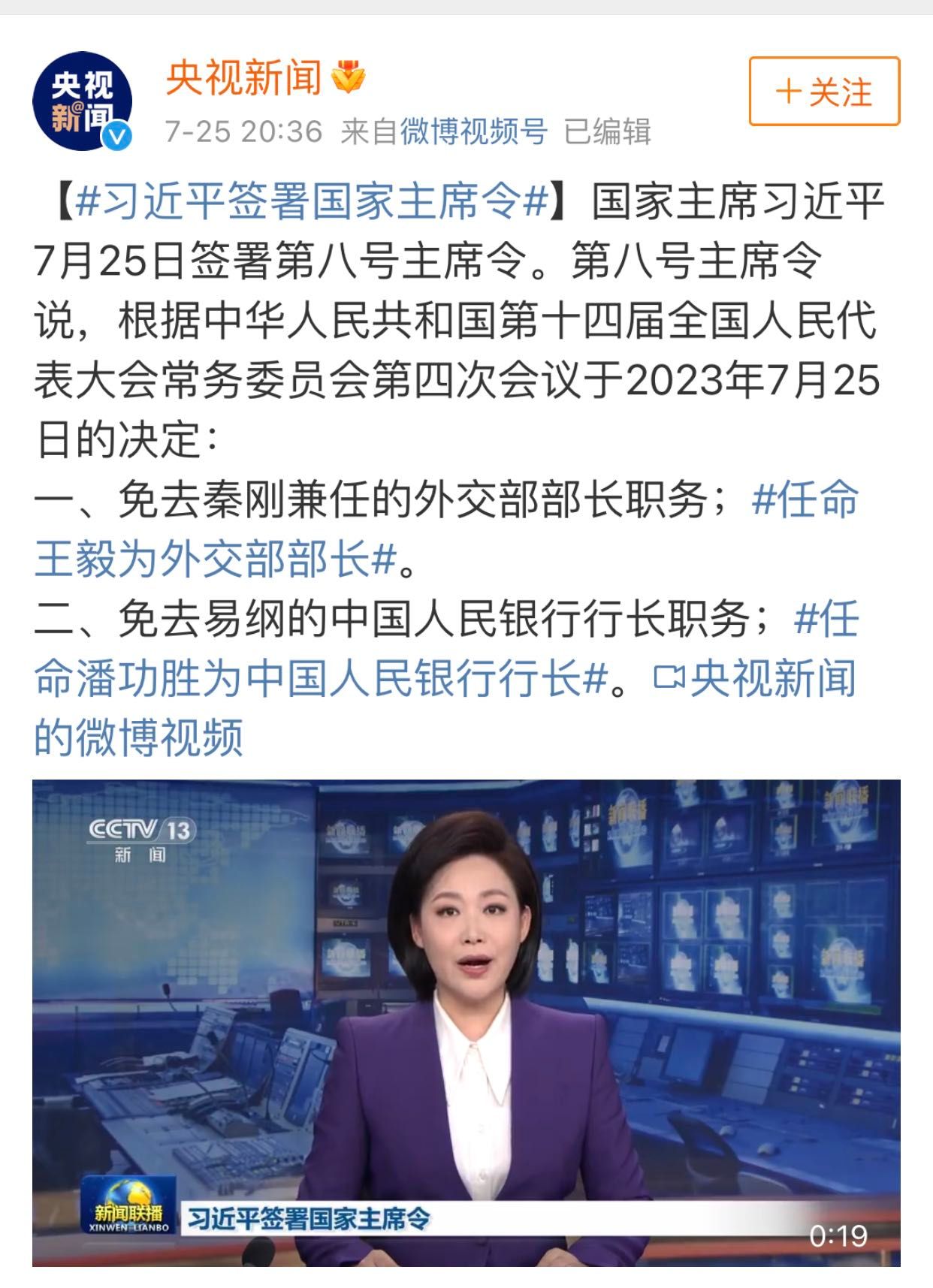 快讯:秦刚被免职,任命王毅为外交部长! 国家主席习近平7月25日签署第八号主席令: 根据中华人民共和国第十四届全国人民代表大会常务委员会第四次会议于2023年7月25日的决定: 一、免去秦刚兼任的外交部部 ...