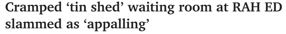 据媒体报道,耗资$24亿建造的Royal Adelaide Hospital急诊科的分诊中心和候诊室是一个狭窄的 "铁皮棚",引发了病人对"令人震惊的第三世界"条件的抱怨。 周四上午10点是一个相对安静的时间段,新 ...