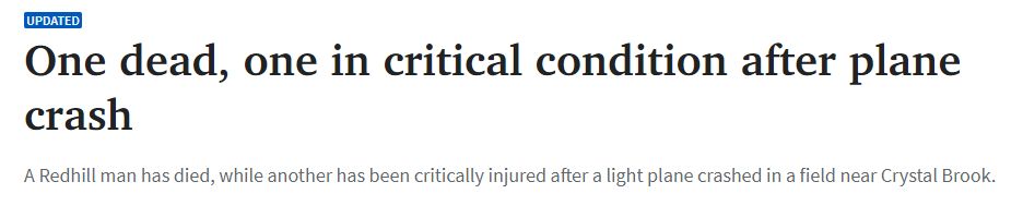 一架轻型飞机在南澳坠毁,一死一伤! 在南澳Crystal Brook附近,一架轻型飞机坠毁在田野里,一Redhill男子死亡,另一人伤势严重。 澳洲运输安全局已启动运输安全调查,预计调查人员于周一抵达现场。 ...