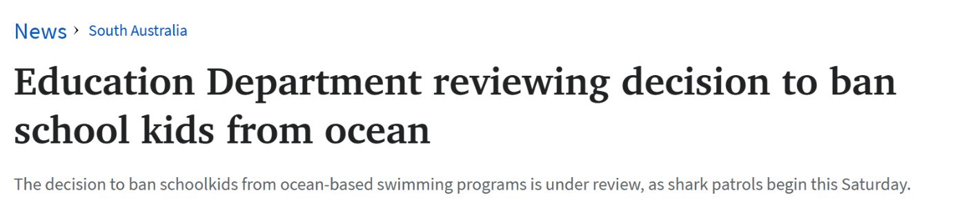 据报道,在上周五鲨鱼袭击事件后,政府决定禁止学生参加海洋课程,遭到广泛反对。 这次审查将给教育部一个机会,以纠正他们所面临的来自学校、家长和人们的舆论。 大多数学校表示担心,如果禁止孩子们参加 ...