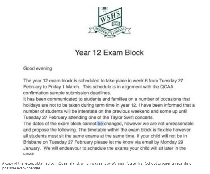 据悉,布里斯班的一所公立学校正在考虑将其12年级的考试安排在Taylor Swift澳大利亚巡回演唱会结束后,以便学生能够参加悉尼和墨尔本的演唱会。 如果孩子无法参加定于2月27日至3月1日举行的第六周考试,Wy ...