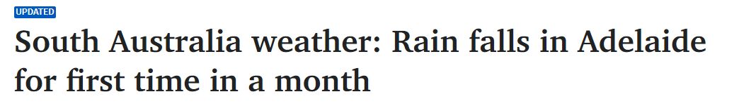 周日,阿德终于迎来了29天来的第一场降雨,周一上午,南澳各地仍有阵雨。 不过,由于阿德一夜之间降雨量不足半毫米,预计今天该州各地的降雨量也不会太多。 "南部农业区的降水量只有两到三 ...